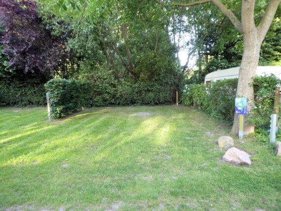 Auf unserem Platzplan sind die Lagen der Stellplätze zur groben Orientierung eingezeichnet. Norden befindet sich rechts, der Ratzeburger See oben (im Westen). Die Karte ist gegenüber der üblichen Konvention mit „Norden oben“ um 90 Grad gedreht. Größere Bäume sind symbolisch eingetragen und die Richtung des Schattenwurfs zur Mittagszeit ist angedeutet.