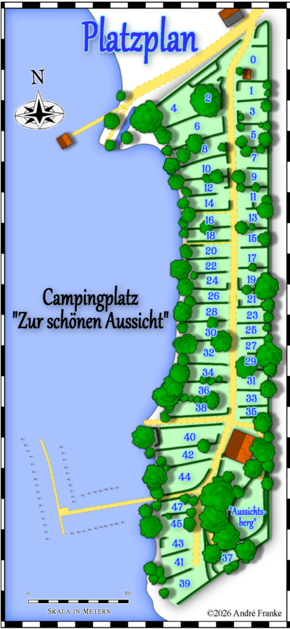 Plan unseres Campingplatzes und der Platznummern. Unser altes Anmeldehäuschen auf Platz 0 ist nicht mehr besetzt. Es gibt keine Anmeldung mehr vor Ort. Eine Anmeldung ist nur noch Online möglich. Die Platzverwaltung befindet sich außerhalb des Platzgeländes.